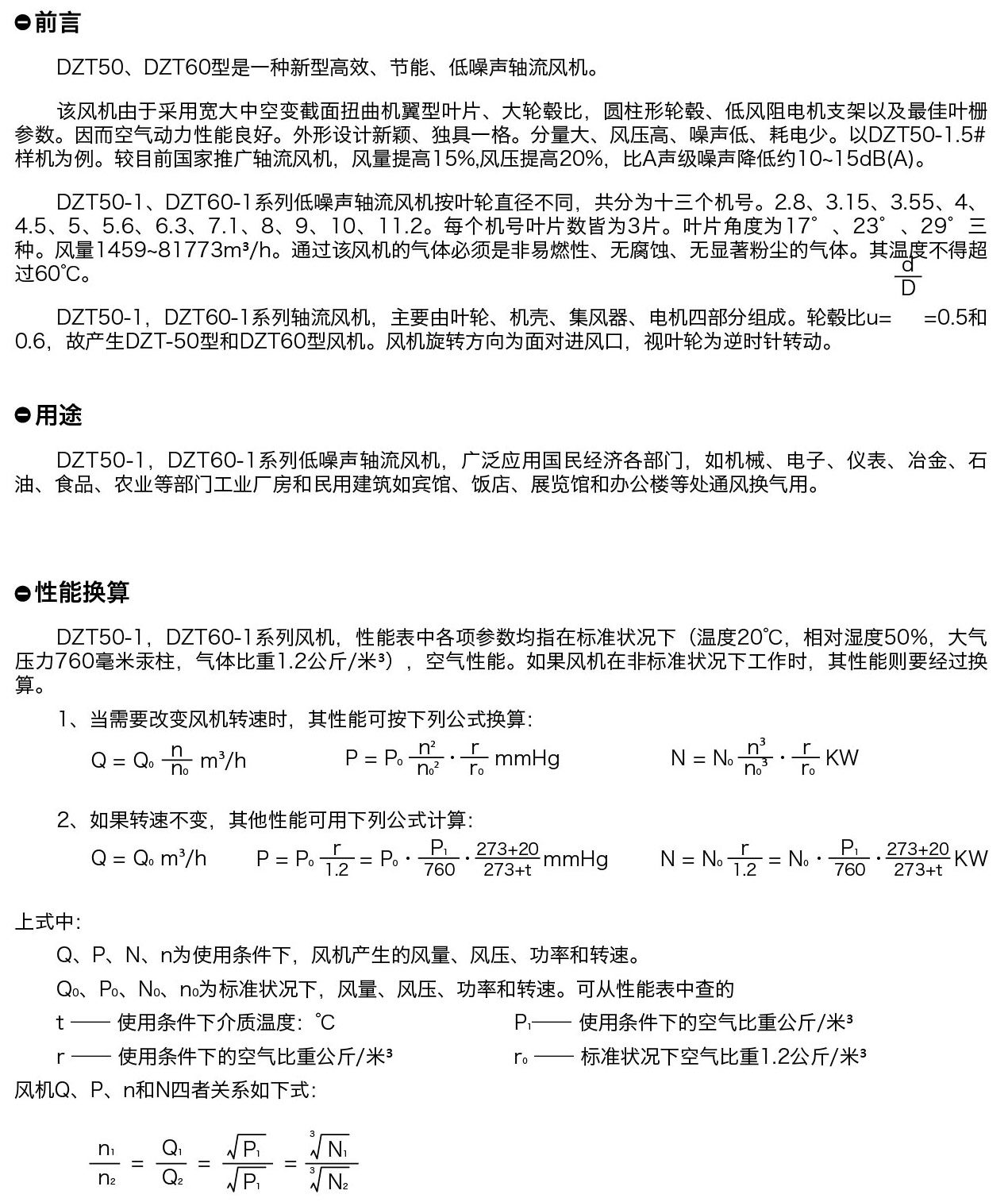 DZT50、DZT60型是一種新型高效、節(jié)能、低噪聲軸流風機。 該風機由于采用寬大中空變截面扭曲機翼型葉片、大輪轂比,圓柱形輪轂、低風阻電機支架以及最佳葉柵 參數。 因而空氣動力性能良好。外形設計新穎、獨具一格。 分量大、風壓高、噪聲低、耗電少。