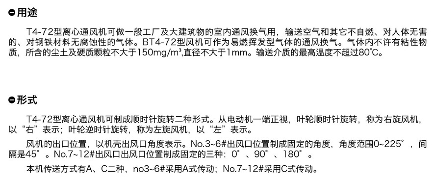 T4-72型離心通風(fēng)機可做一般工廠及大建筑物的室內(nèi)通風(fēng)換氣用,輸送空氣和其它不自燃、對人體無害 的、對鋼鐵材料無腐蝕性的氣體。BT4-72型風(fēng)機可作為易燃揮發(fā)型氣體的通風(fēng)換氣。氣體內(nèi)不許有粘性物 質(zhì),所含的塵土及硬質(zhì)顆粒不大于150mg/m3,直徑不大于1mm。輸送介質(zhì)的最高溫度不超過80°C。