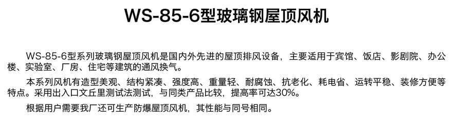 WS-85-6型系列玻璃鋼屋頂風(fēng)機(jī)是國內(nèi)外先進(jìn)的屋頂排風(fēng)設(shè)備,主要適用于賓館、飯店、影劇院、辦公 樓、實驗室、廠房、住宅等建筑的通風(fēng)換氣。