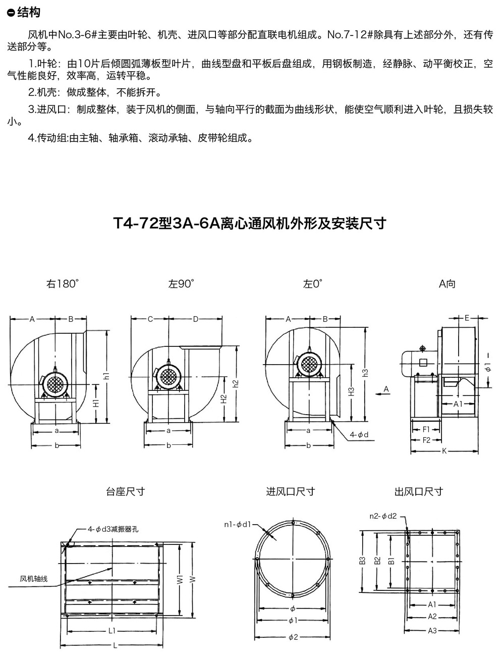 T4-72型離心通風(fēng)機可做一般工廠及大建筑物的室內(nèi)通風(fēng)換氣用,輸送空氣和其它不自燃、對人體無害 的、對鋼鐵材料無腐蝕性的氣體。BT4-72型風(fēng)機可作為易燃揮發(fā)型氣體的通風(fēng)換氣。氣體內(nèi)不許有粘性物 質(zhì),所含的塵土及硬質(zhì)顆粒不大于150mg/m3,直徑不大于1mm。輸送介質(zhì)的最高溫度不超過80°C。